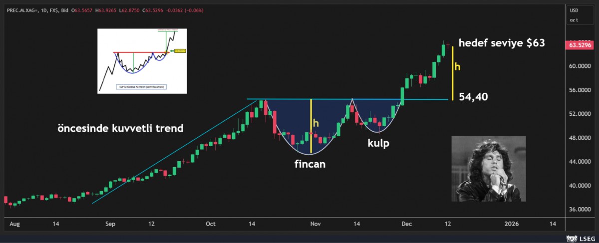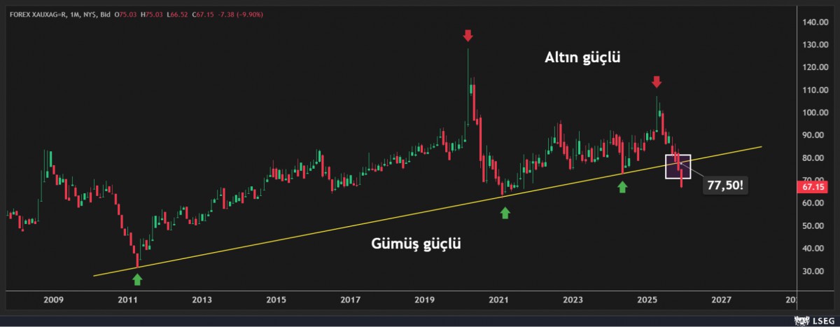 - Büyük bir potansiyel barındırdığını söylediğimiz gümüş, dün akşam saatlerinde 64,30 dolar seviyesine kadar yükselerek yeni bir rekor kırdı. Teknik mânâda bir süredir dile getirdiğimiz 63 dolar hedefimiz de gerçekleşmiş oldu. Sanayi talebindeki artış, azalan stoklar ve gümüşün ABD’nin kritik mineraller listesine girmesi fiyatları desteklerken, yılbaşından bu yana gümüşün %120 yükselişle etkileyici performansını devam ettirdiğini görüyoruz. Altın ise dün akşam saatlerinde 4,285 dolar seviyesine kadar yükselerek son yedi haftanın en yüksek seviyesini test ederken, kısa vadede 4,385 dolar (zirve) seviyesinin test edilmesini bekliyoruz. Altın gümüş rasyonda önemsediğimiz 77,50 seviyesinin aşağı yönlü geçilmesi ardından aşağıda 67 seviyesi dün itibariyle test edildi. Basitçe, bir ons altın geçen ay 77,50 ons gümüş alabilirken, şimdi ise 67 ons gümüş alabiliyor. Bu rasyonun majör anlamda gümüş lehine iyileşmeye devam edeceğini düşünüyoruz! (bakınız grafik).
