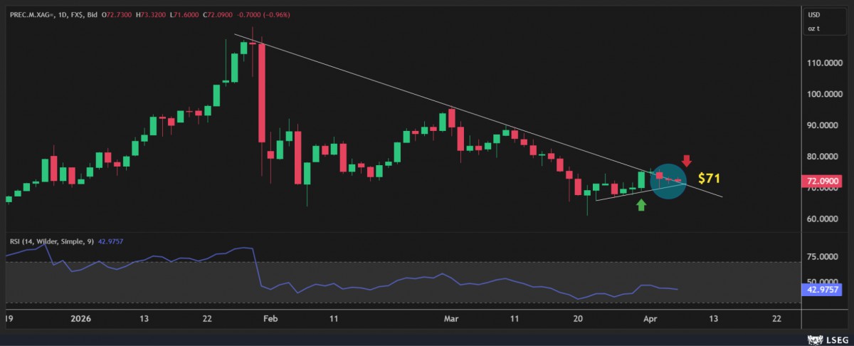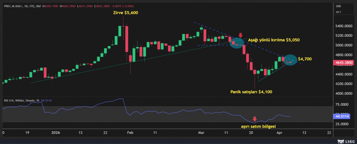 - Tüm bu gelişmeler cereyan ederken, faiz getirisi olmayan altının da baskı altında kalmaya devam ettiğini görüyoruz. Altının ons fiyatı, savaşın hükûm sürdüğü Mart ayını %11'den fazla düşüşle tamamlaması ardından yeni aya da pek de iyimser başlamadığını söylememiz gerekiyor. Altın için kalabalıkların heyecanına pek de kapılamadan bir süredir gelişmeleri takip etmek üzere kenarda bekliyoruz. Teknik mânâda önemsediğimiz aşağıdaki grafikten de görülebileceği üzere, 4,700 dolar seviyesinin üzerinde temiz bir günlük kapanış görmeden hamle yapmayacağız. Gümüş cephesinde ise son günlerde 71 dolar etrafında sıkışmanın belirgin bir hâl aldığını görüyoruz. Teknik bir bakış açısıyla, yükseliş isteğinin devam edebilmesi adına aşağıda 71 dolar seviyesinin altında kapanış görmemiz gerekiyor.