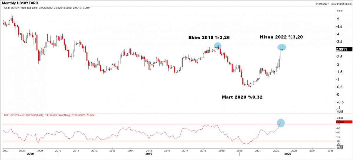 - Piyasaların kılavuz kargası, risksiz veya borçlanma araçlarına gösterge olarak kabul edilen (ABD dolarının piyasa faizi) 10 yıllık devlet tahvil getirisi dün sabah %3,20 seviyesini test ederek son 3,5 senenin zirvesine yükselmesi, piyasalarda yaşanan fiyatlama davranışı hakkında önemli ipuçları veriyor. Daha basit bir anlatımla, piyasalar, FED'den oldukça kuvvetli bir faiz artış beklentisi içindeler ve buna rağmen enflasyon korkusunun hâlen daha etkili olmaya devam ettiğini düşünüyoruz. Takdir edersiniz ki, faizlerin artacak olması da, ekonomik yavaşlama beklentilerini yani resesyon kaygısının ivme kazanmasına neden oluyor.