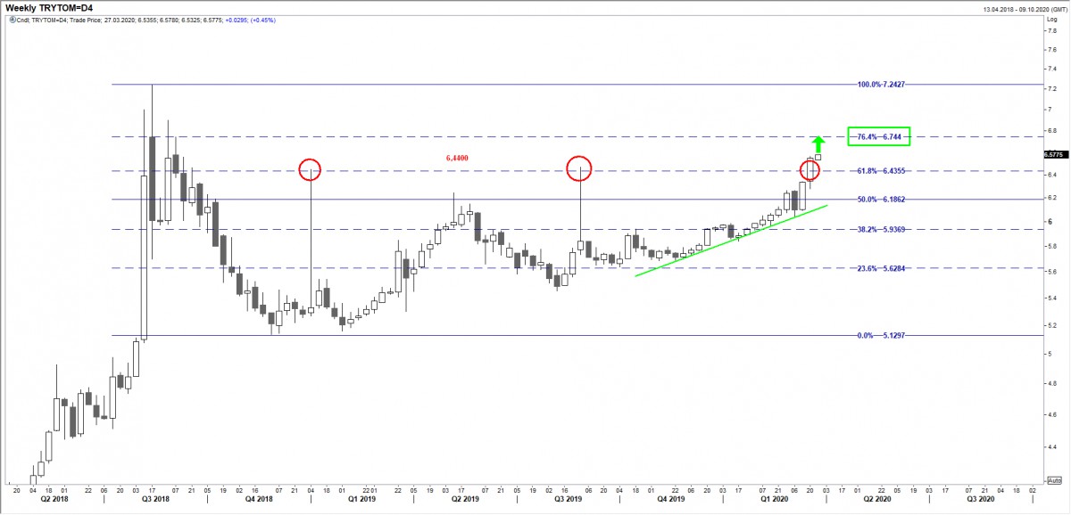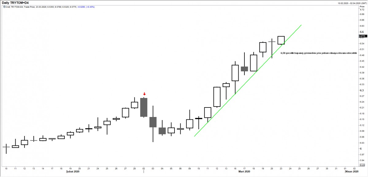 - USD/TRY kuru adım adım yukarıya gitmeye devam ediyor. 6,50 seviyesi altında gecelik kapanış görmeden, yukarda 6,74 seviyesi radar menzilinde durmaya devam edecektir (bakınız grafik).