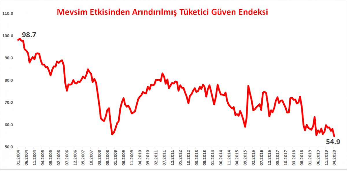 TCMB - TÜİK ortaklaşa çalışması ile hesaplanan tüketici eğilim anketi, Nisan ayında, bir önceki aya göre 3,3 puan gerileyerek 54,9 değerini aldı. 100’ün altı tüketici güvenin düşük olduğunu gösterirken, tarihinin de en düşük seviyesi ile karşı karışıyayız. Endeksi oluşturan alt kalemlere baktığımızda en fazla bozulma, gelecek 12 aylık dönemde tasarruf etme eğiliminde görülüyor.