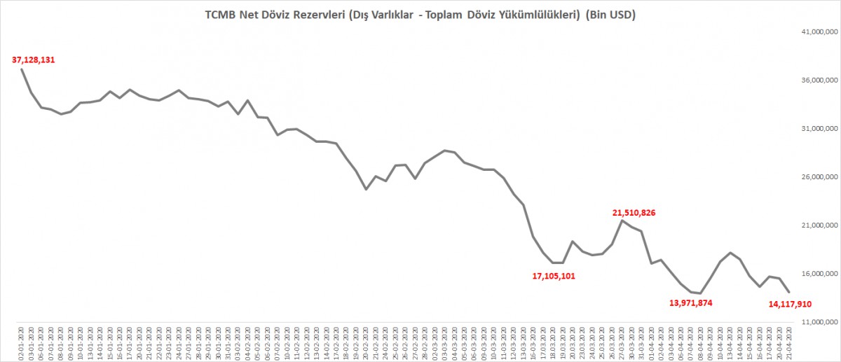 TCMB'nin net rezervleri 21 Nisan itibarı ile 14,1 milyar dolar seviyesine geriledi. Rezervler sene başında 37,1 milyar dolar seviyesinde idi. Rezervlerde hızlı erime, kırılganlk işareti olarak okunuyor.