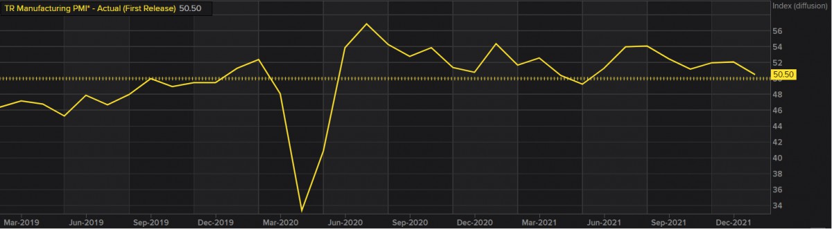 Türkiye'de ISO-Markit işbirliği ile yayımlanan imalat sanayi PMI endeksi Ocak ayında 50,5 değerine geriledi. Endeks Aralık ayında 52,1 seviyesinde idi. Büyümenin öncü verisi olarak takip edilen PMI verisi, 50,0 seviyesinin üzeri büyüme, altı daralma olarak okunuyor. Ocak ayında gelinen seviye ise son 8 ayın en düşüğü olarak ön plana çıktı. Her ne kadar eşik değerinin üzerinden ve teknik olarak büyüme devam etse de, Ocak ayında ivme kaybı yaşandığını da not etmek gerekiyor. Elektrik kesintilerinin de yaşanan yavaşlamada pay sahibi olduğunu düşünüyoruz. Hülâsa, yeni yıla büyüme açısından pek de olumlu bir tablo ile başlanmadığını görüyoruz.