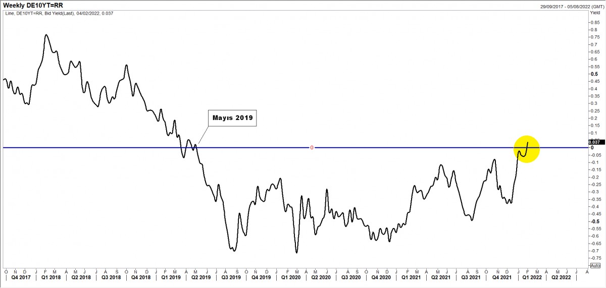 FED ve İngiltere Merkez Bankalarının faiz artırım döngüsüne geçmelerine paralel, gösterge Alman 10 yıllık tahvil faizi de Mayıs 2019'dan sonra ilk kez %0 seviyesinin üzerine yükseldi.
