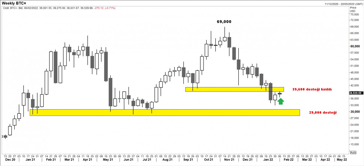 Teknik bir bakış açısıyla 39,600 seviyesinde bulunan kritik destek seviyesini aşağı yönlü kıran ve 32,950 dolar seviyesine kadar adeta serbest düşüşe geçen Bitcoin, dün yeniden zemin test etmek adına 39,300 seviyesine varan bir yükseliş kaydetti. Mevcut uzun pozisyonlarmızı, 39,600 seviyesinin üzerinde kapanış görmemiz durumunda güçlendireceğiz.