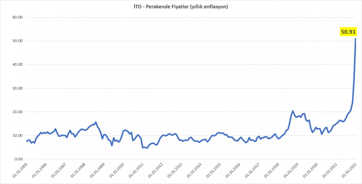 İstanbul Ticaret Odası'nın (İTO) İstanbul'da perakende fiyat hareketlerinin göstergesi olan İstanbul Ücretliler Geçinme İndeksi'nde artış Ocak ayında geçen yılın aynı ayına göre %50,91, toptan fiyat hareketlerini yansıtan Toptan Eşya Fiyatları İndeksi ise %53,96 oldu.
