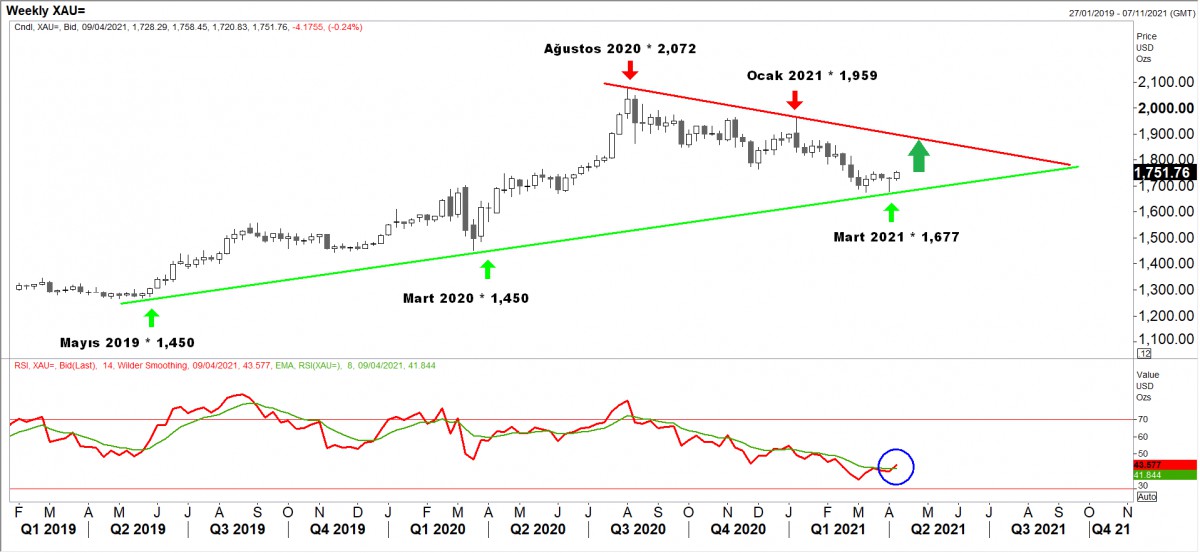 Grafiğimiz ana hatları ile pek de değişmedi. Güç göstergesi RSI alım sinyali verirken, 1,677 seviyesinden seken (yükseliş trend çizgisi) ons altının, 1,800 seviyesinin üzerine doğru, yukarı yönlü hareketine devam etmesini bekliyoruz.