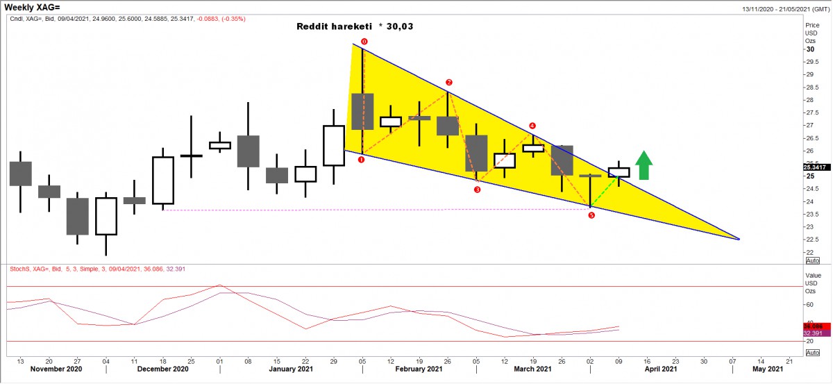 Gümüşte beklediğimiz yükseliş yavaş yavaş gerçekleşiyor. 25,30 seviyesinin üzerine ve mavi alanın dışına çıkan gümüşte hareketin devam etmesini öngörüyoruz. Haftalık kapanış önemli bir sinyal olacaktır.