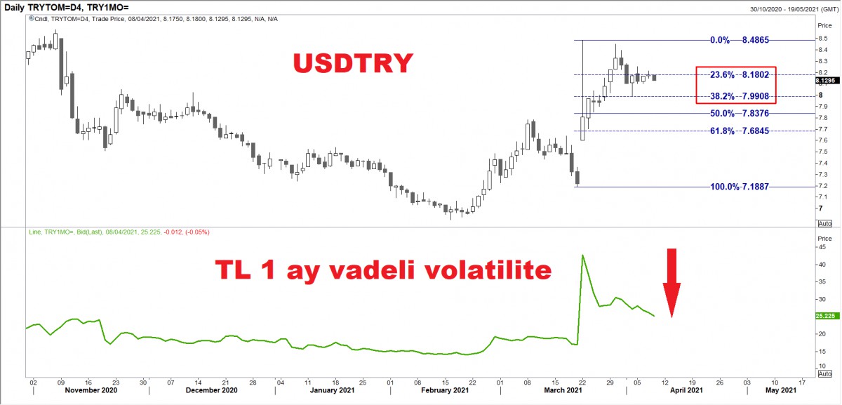USDTRY kurunda, 1 ay vadeli volatilite 25 seviyesine gerileyerek Ağbal sonrası dönemin en düşük değerini aldı. Hatırlayınız ki, 19 Mart'ta 17 seviyelerinde olan volatilite (oynaklık) 22 Mart'ta 45'e kadar yükselmişti. USDTRY kurunda 8,18 – 7,99 arası sıkışmanın PPK toplantısına kadar devam edeceğini öngörüyoruz.