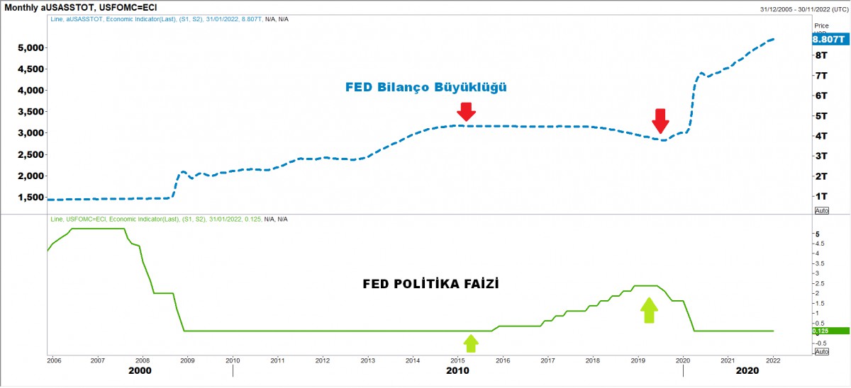 Aşağıdaki grafikte, 2015 yılında başlayan bilanço daraltmanın ne kadar bebek adımları ile yapıldığı ve faizlerin de kademeli bir şekilde artırıldığını görebilirsiniz. Powell'ın bu sefer "şartlar farklı" diyerek söylemini kuvvetlendirmesi, FED'in daha erken ve daha hızlı davranabileceği anlamına geliyor.