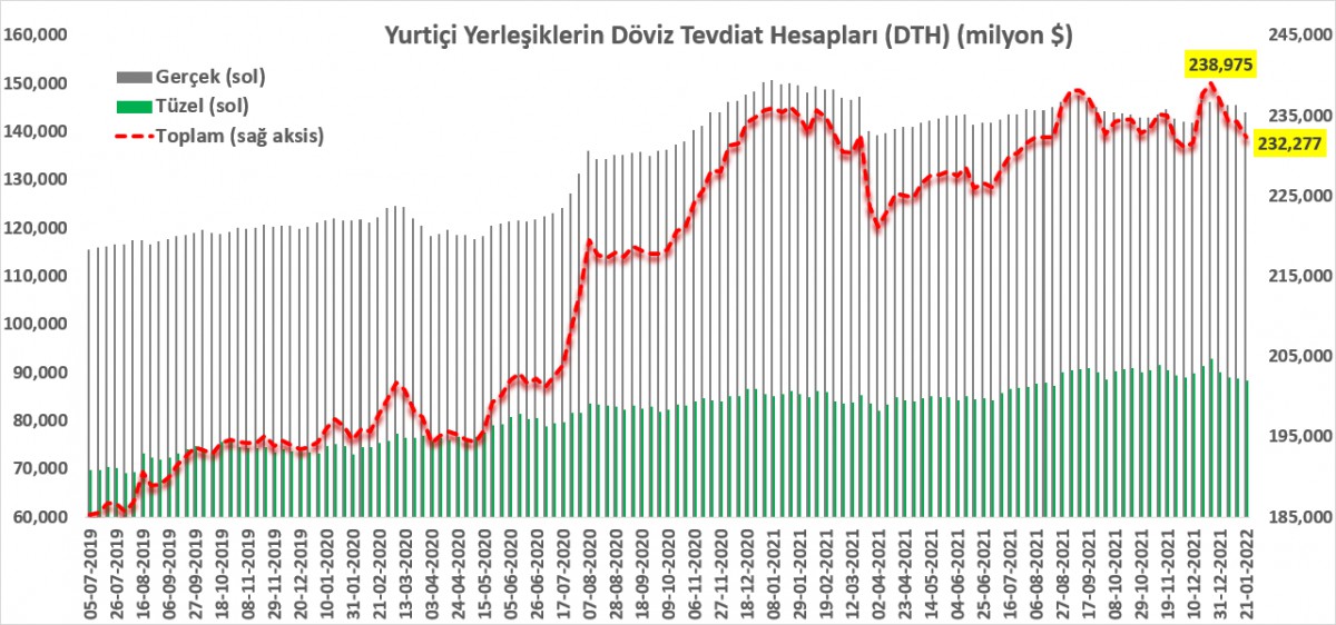 TCMB verilerine göre, son 4 haftada DTH rakamları 6,7 milyar dolar azaldı. Hatırlamak gerekirse, 17 Aralık ile biten haftada, 6,1 milyar dolar artış kaydetmişti. DTH tarafında görülen azalma ve beraberinde bilançonun TL tarafının daha da fazla artması, sisteme dışarıdan döviz girişi olduğunu da gösteriyor.