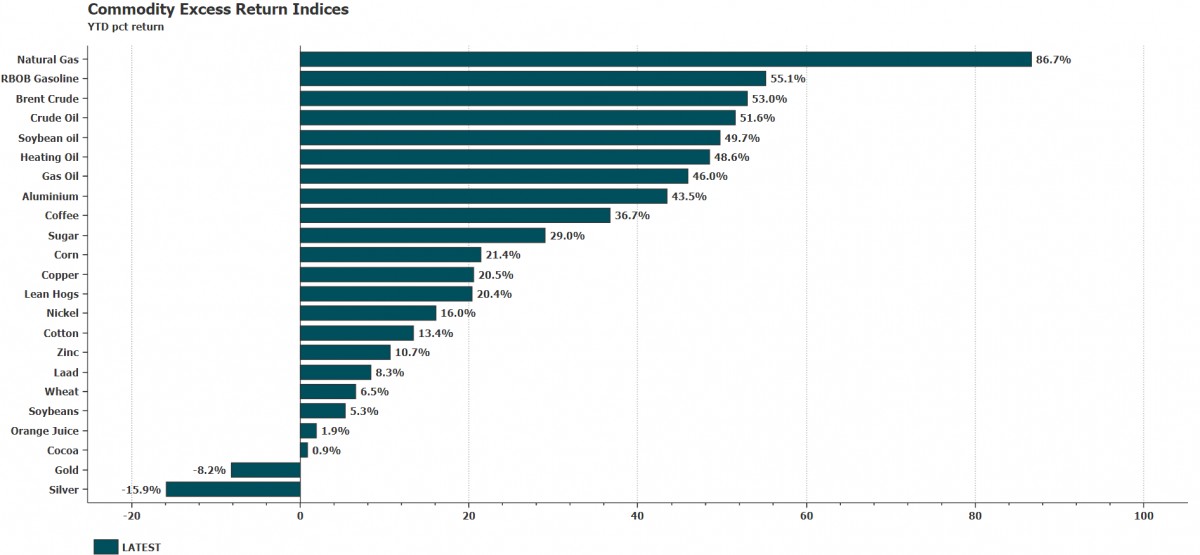 Aşağıdaki grafikten görülebileceği üzere, doğal gaz ve petrol fiyatları yılbaşına göre getiri skalasında ilk sırada yer alırken, kıymetli madenler en alt sırada yer almaya devam ediyor.