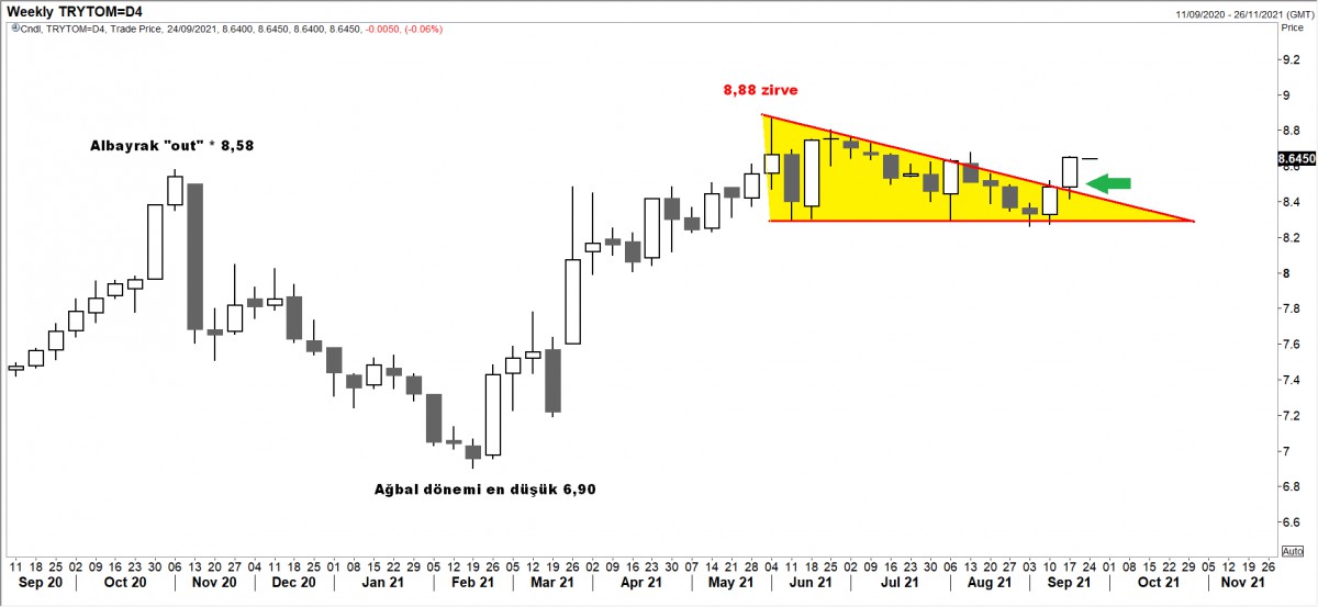 - Hava geçen hafta içerde de bozdu. Sn. Cumhurbaşkanı Erdoğan'ın enflasyonla mücadele hakkında sözleri, piyasaların kafasında faiz indirim sinyalini tetikleyince, USDTRY kuru yurtdışı havanın da tatsız olmasının yardımı ile 8,65 seviyesine yükselerek son 5 haftanın zirvesini test etti.