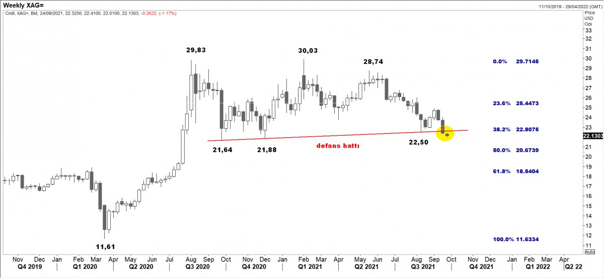 Gümüşte geçen hafta yaşanan sert satışlarla 22,50 seviyesi civarında olan destek hattının da altına geçildiğini görüyoruz. Alım için, 22,50 dolar seviyesi altında aceleci olmadan düşüşün son bulmasını bekleyeceğiz. 2020 Mart ayında 11 dolar seviyelerinden başlayan ve 2021'de 30 dolara kadar yükselen ons gümüşte, 22,50 dolar altında %50 düzeltme seviyesi olan 20,60 ve devamında 18,50 seviyeleri (görülmesi durumunda) radar menzilimizde olacaktır.