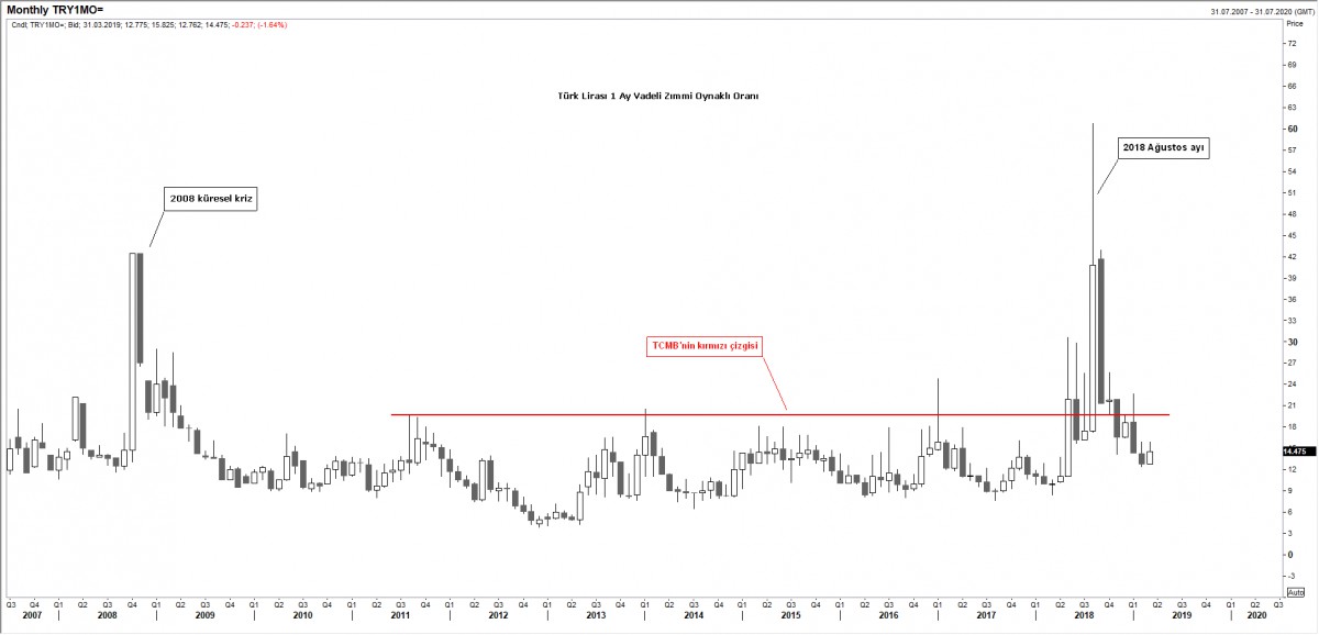 Ağustos 2018’de yaşanan kur şoku / atağı ile volatilitenin korkunç seviyelere çıkması ardından TCMB’nin politika tepkisi vermesi ile (artırılan faiz oranları) sakinliğin yeniden sağlandığını görüyoruz. Aşağıdaki kırmızı çizgi, TCMB’nin de kırmızı çizgisi. Ne zaman ki oynaklık kırmızı çizgiyi aşsa, TCMB’nin politika tepkisi verdiğini not etmek gerekiyor. Volatilitenin 20 seviyesinin altına gelerek sakinlemesi, kur cephesinde de adeta yaprak kıpırdamıyor söylemini anlatıyor. Düşen volatilitenin, yatırımcılar tarafından riskli ve açık pozisyonları hedge etmek için kollanması gerektiğini düşünüyoruz