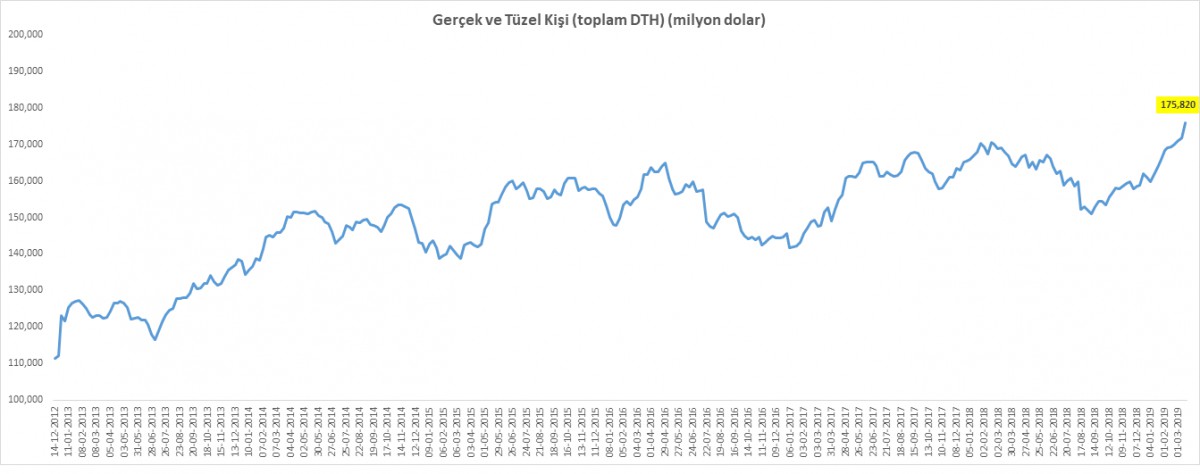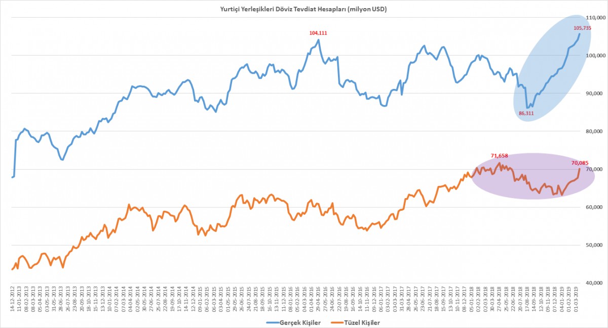 - Detaylara indiğimizde, dövizle işi olmayan yurtiçi yerleşik gerçek kişilerin, 15 Mart ile biten haftada 1,6 milyar dolar daha aldıkları ve DTH’larının 105,7 milyar dolar ile tüm zamanların zirvesine yükseldiğinin altını çizelim. Yılbaşına göre artış miktarı 9,2 milyar dolar olurken, 17 Ağustos 2018 haftasına göre ise 19,6 milyar dolara oldu. Ters para ikamesinin son sürat devam etmesini büyük kırılganlık olarak görüyoruz