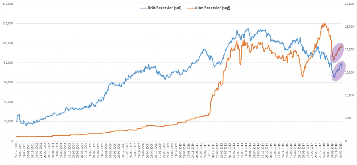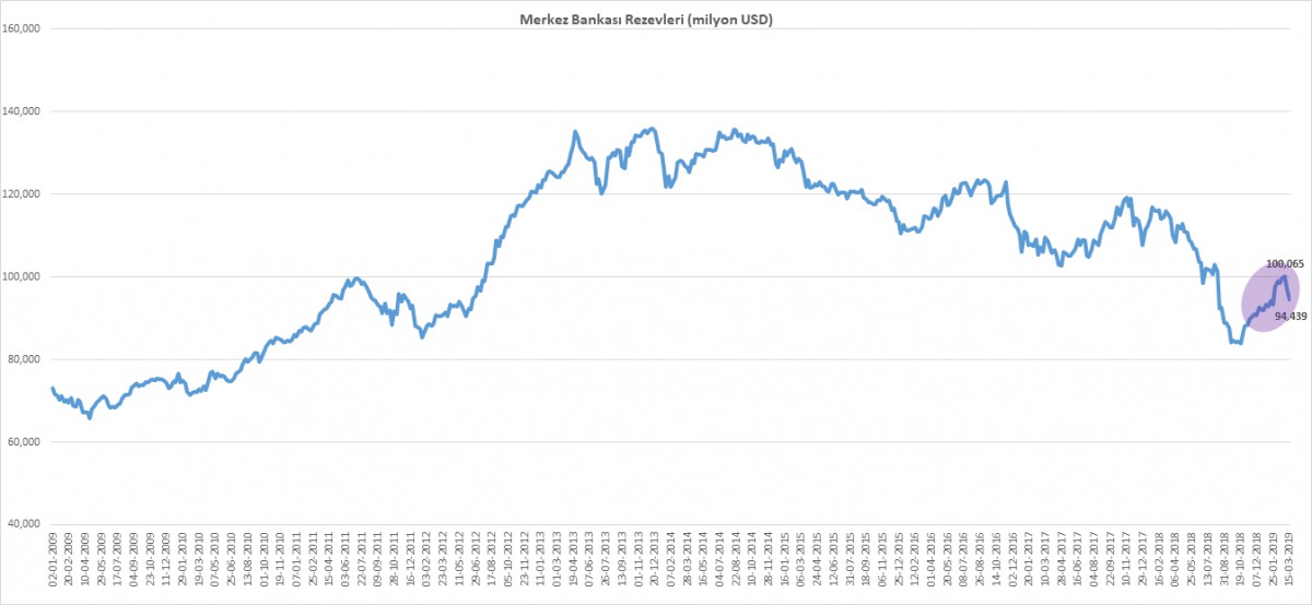 TCMB rezervlerinin son 2 haftada ciddi anlamda azaldığını görüyoruz. 01 Mart ile biten haftada 100 milyar dolara yükselen rezervler (brüt+altın), 15 Mart ile biten haftada 94,4 milyar dolara geriledi