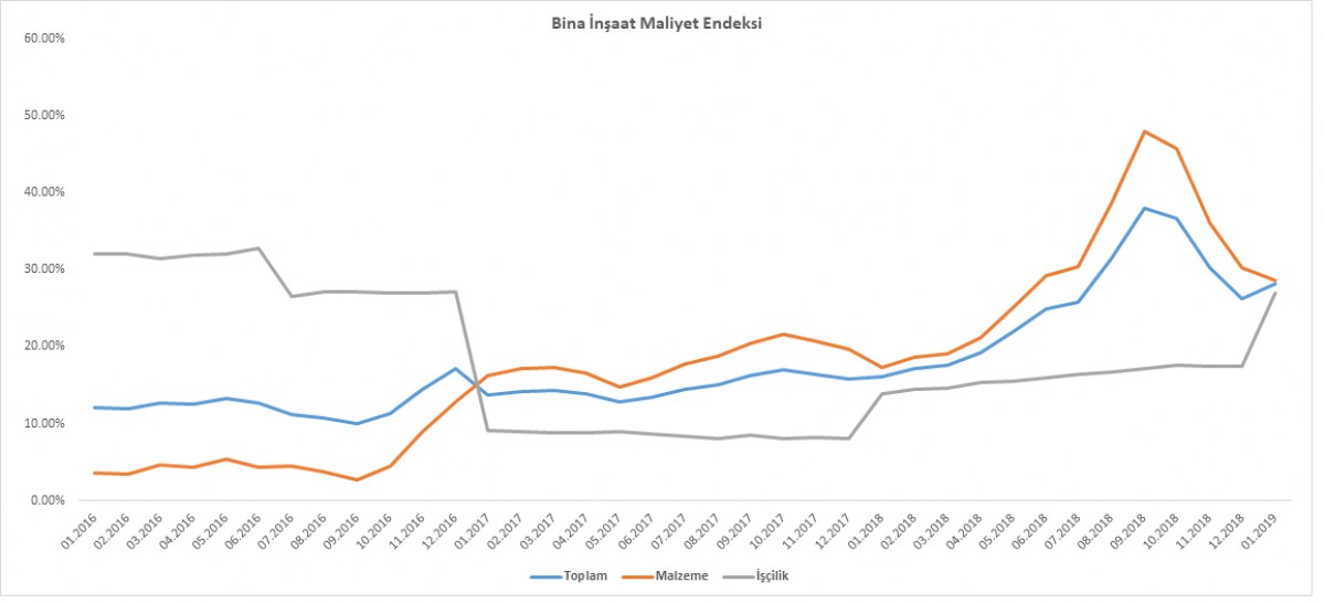- TÜİK verilerine göre bina inşaat maliyet endeksi Ocak ayında yıllık bazda %28,11 ; malzeme maliyet endeksi %28,68 ; işçilik maliyet endeksi ise %26,75 arttı. İnşaat sektöründe işlerin pek de iyi gitmediğini gösteren bir veri daha görmüş olduk (bakınız grafik)