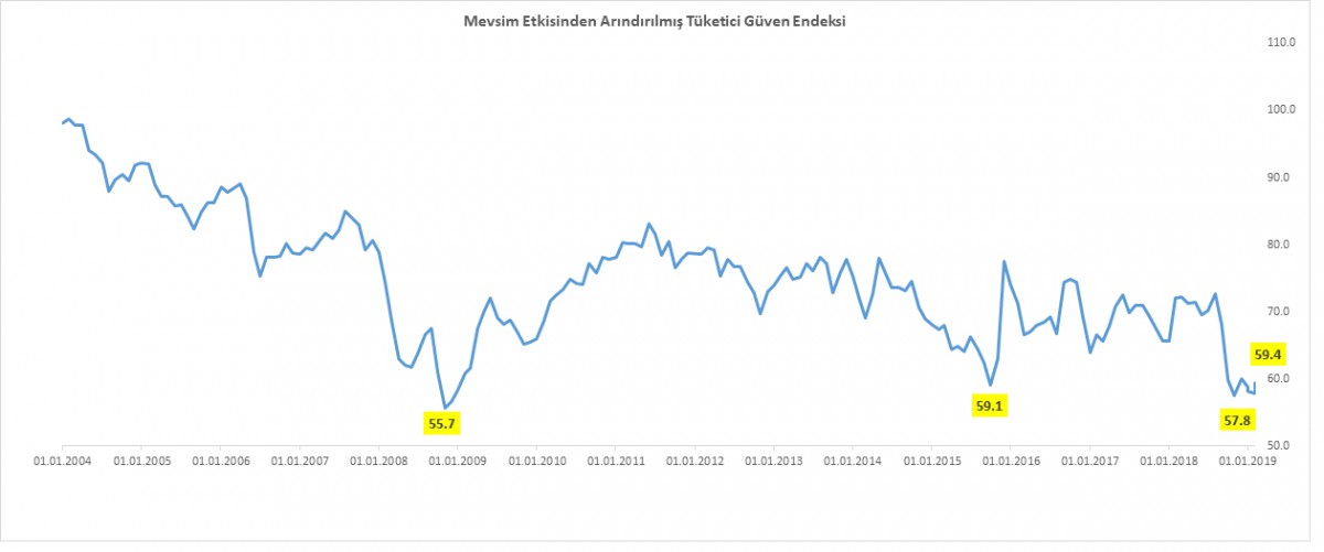 TÜİK ile TCMB işbirliğinde yürütülen tüketici eğilim anketi sonuçlarından hesaplanan mevsim etkilerinden arındırılmış tüketici güven endeksi, Mart ayında bir önceki aya göre %2,9 oranında artışla 59,4 değerini aldı