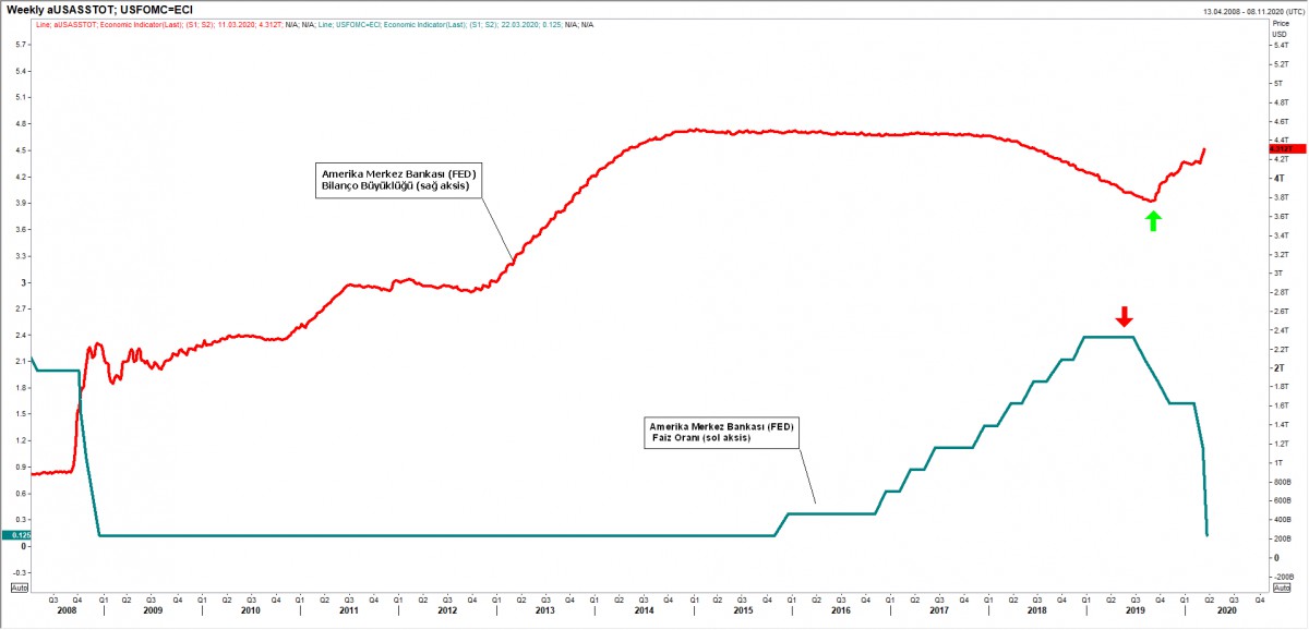 Adeta günler içerisinde 2008 kriz döneminde geri döndük. FED, son iki olağanüstü toplantısında, faiz oranlarını hızla indirerek %0-0,25 aralığına çekti (yeşil çizgi). Kırmızı çizgi, yani bilanço büyüklüğünün de her geçen gün daha da kuzeye gideceğine (piyasalara para dağıtmaya devam edeceğine) kesin gözüyle bakıyoruz.