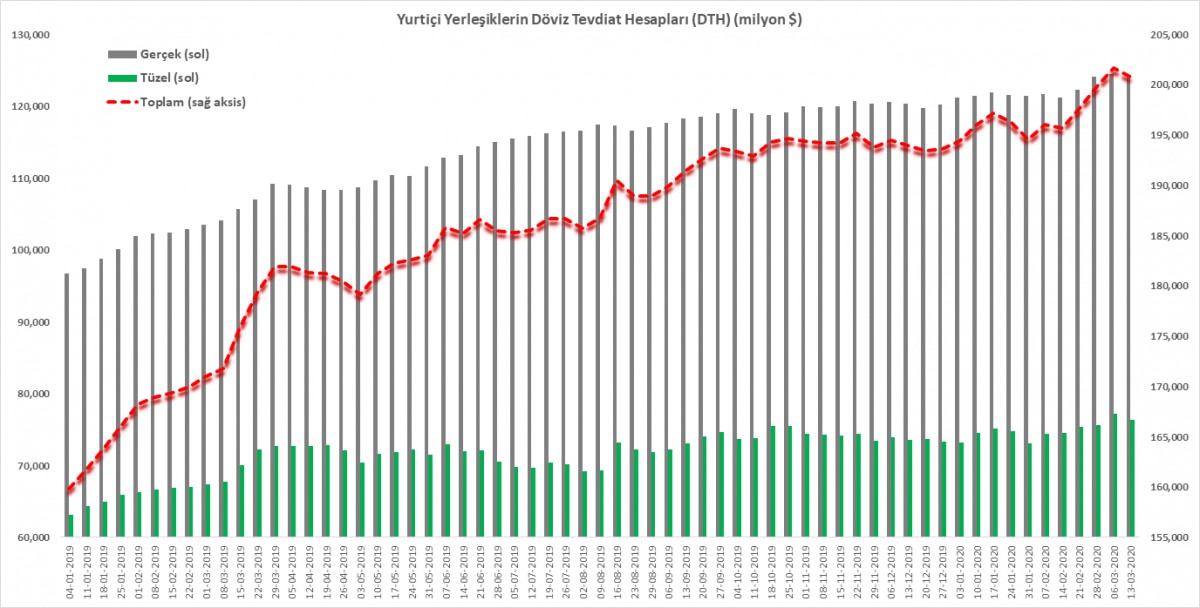 Her hafta TCMB’nin düzenli bir şekilde açıkladığı Haftalık Para ve Banka İstatistiklerine göre, yurtiçi yerleşiklerin bankalarda bulunan Döviz Tevdiat Hesapları (DTH) 13 Mart ile biten haftada, bir önceki haftaya göre yaklaşık 0,94 milyar dolar azalarak 200,7 milyar dolar oldu. Gerçek kişilerin DTH’ları 0,1 milyar dolar azalarak 124,4 milyar dolar olurken, tüzel kişilerin ise 0,8 milyar dolar azalarak 76,4 milyar dolar oldu.
