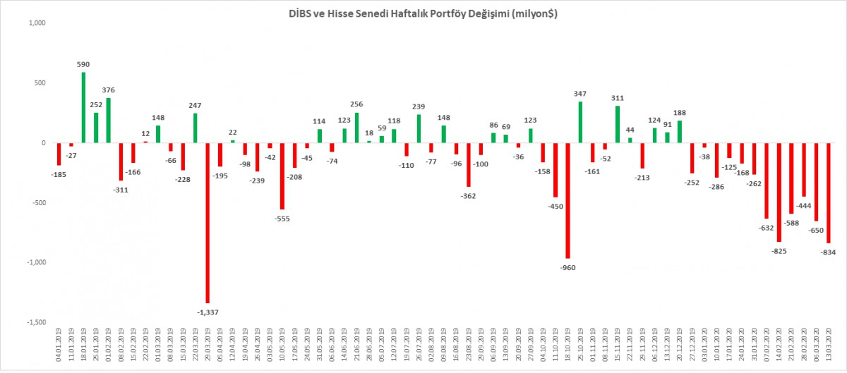 TCMB tarafından benzer bir şekilde her hafta açıklanan Menkul Kıymet İstatistikleri raporuna göre, yabancı yatırımcıların TL ve TL cinsi varlıklara yönelik küskünlüğü 13 Mart haftasında da devam etmiş. Buna göre, DIBS ve hisse senedi piyasalarında bir önceki haftaya göre çıkış 834 milyon dolar oldu (hisseden 201 milyon dolar, DİBS’ten 632 milyon dolar çıkış). Yılbaşına göre bakılırsa, toplam çıkış 4,9 milyar dolar oldu. Bu oldukça yüksek bir rakam.