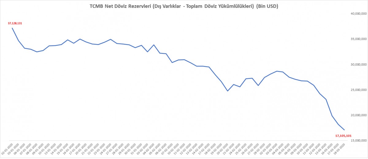 TCMB net döviz rezervleri, 18 Mart tarihinde 17,1 milyar dolara geriledi. Söz konusu rakam yıl başında 37,1 milyar dolar idi.