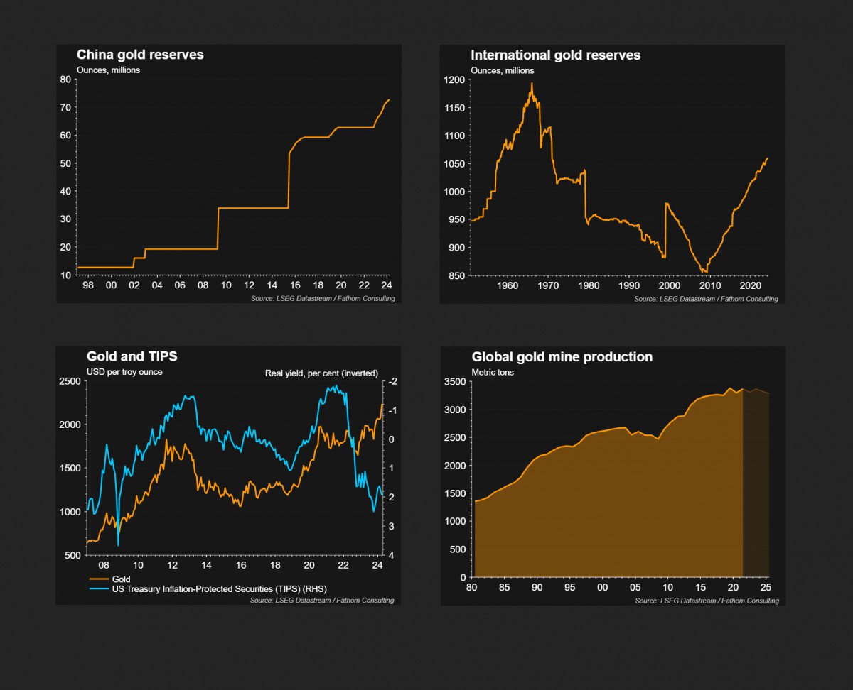 ABD Dolarının reel faizi artarsa, genelde faiz getirisi olmayan altın düşerdi. 2022'den beri aralarında olan korelasyonun koptuğunu görüyoruz. Dolar tabir caizse 'silahlaştırılması' sonrası merkez bankalarının (özellikle de Çin, Hindistan ve Türkiye) artan faize rağmen dolar satıp altın aldıklarını, uluslararası altın rezervlerinin de sert bir şekilde yükseldiğini not etmemiz gerekiyor.
