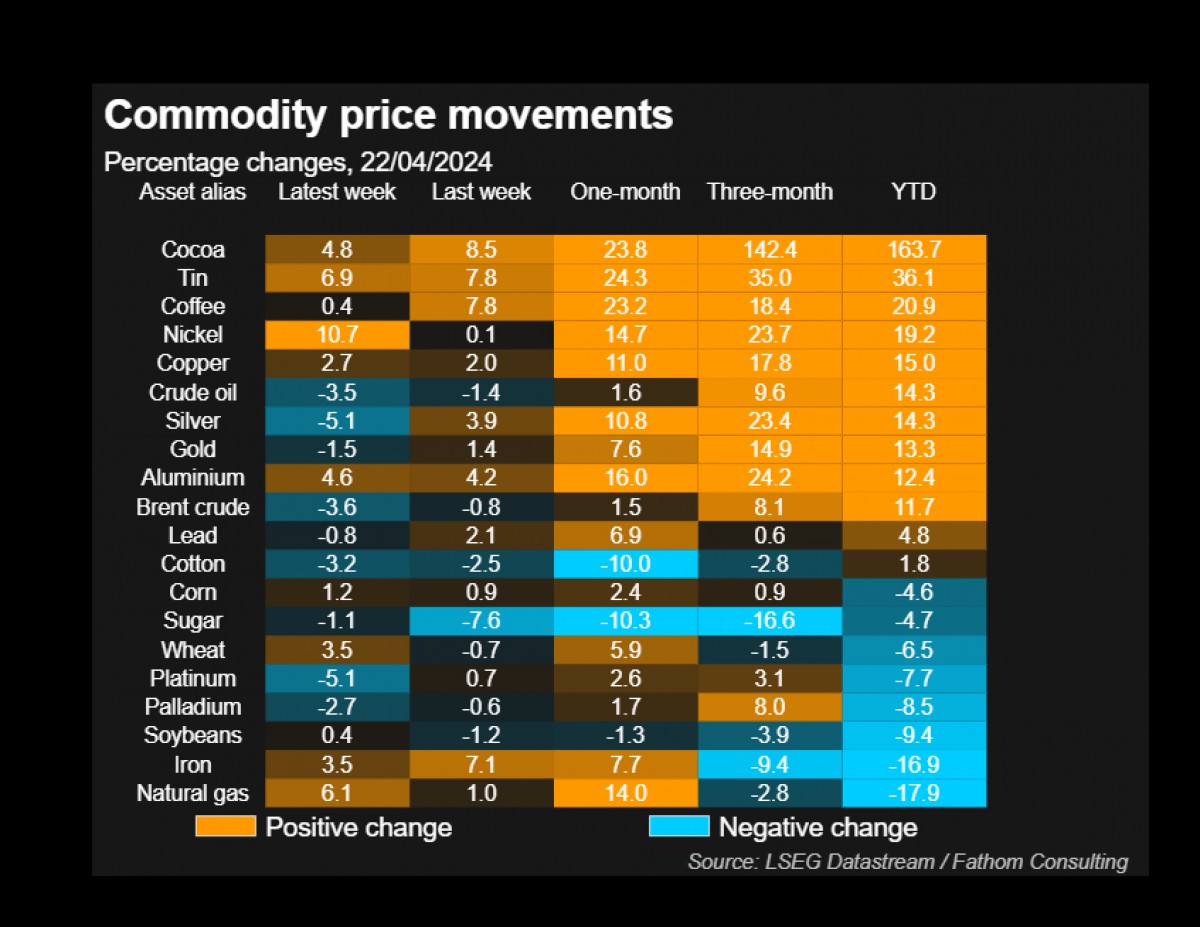 Kakao ayrışarak ilk sırada yer alırken, altın ve gümüş sene başına göre %13-14 getiri ile işlem görmeye devam ediyor. Ukrayna savaşı nedeniyle dolup taşan stoklar ve ılıman hava şartlarına paralel doğalgaz ise son sırada yer almaya devam ediyor.