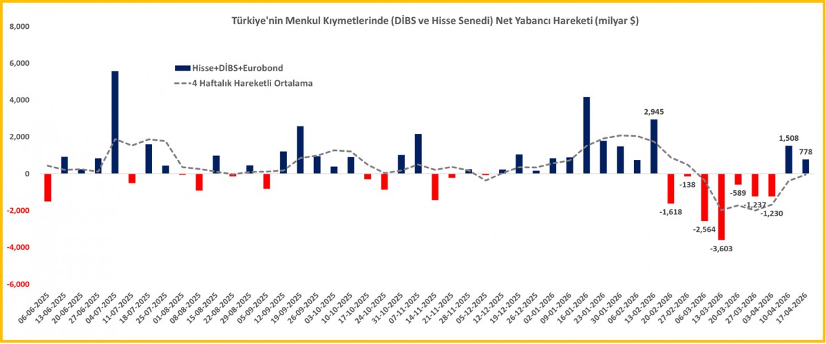 - Yurt dışı cepheye geçmeden önce her hafta Perşembe günü açıklanan lâkin bu hafta 23 Nisan tatili nedeniyle Cuma günü açıklanan TCMB'nin haftalık bültenini de irdelemek isteriz. İlk önce en güncel veriyle başlayalım. TCMB'nin net yabancı para pozisyonu, 22 Nisan valörlü işlemlerde 34,8 milyar dolar ile önemli bir değişim göstermedi. Brüt döviz ve altın rezervlerinin ise 174,5 milyar dolar seviyesine yükselerek son bir ayın en yükseğine geldiğini görüyoruz. TCMB'nin faiz oranlarını sabit tutmasında önemli bir rol oynayan yurt içi yerleşiklerin döviz mevduatları, parite etkisinden arındırılmış seriye göre, 17 Nisan ile sona eren haftada 1,4 milyar dolar artış kaydetse de artışın tamamı tüzel kişilerde olmuş (yani gerçek kişiler döviz talep etmemiş). Yurt dışı yerleşiklerin TL varlıklara yönelik ilgisinde iyileşme gözlemliyoruz. Söz konusu haftada hisse senetlerine yaklaşık 0,6 milyar dolar giriş olmuş. Ateşkes sonrası yabancının Türkiye algısının iyileştiğine yönelik CDS risk priminin de işaret ettiği paralelde bir pozisyonlanma görüyoruz. Acaba hisse senetlerinde biz de yeniden alıcı gözle baksak mı? (bakınız grafik)