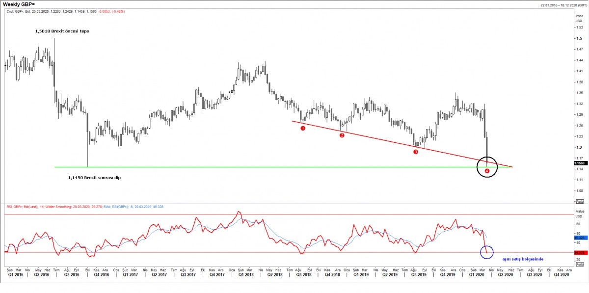 Brexit sonrası anlık olarak test edilen 1,1450 seviyesini göz ardı edersek, dün yaşanan panik satışlarının yardımı (1,1459) ile Sterlin Dolar karşısında 35 senenin dibini test etti. Teknik manada Sterlin’in aşırı satış bölgesine geldiğini düşünüyoruz. Finansal fırtına şu anda o kadar kuvvetli ki, daha da aşağı seviyeler elbette görülebilir. Lakin, teknik manada, aşırı satış bölgesine geldik. Yaşanan gelişmeleri, uzun vadeli düşünenler için, kademeli alım fırsatı olarak okuyoruz.
