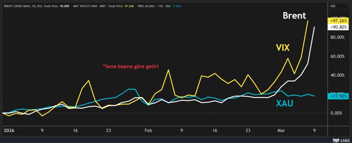 Petrol kükredi, altın suskun: Piyasalar savaşı değil enflasyonu fiyatlıyor- Küresel mali piyasaların yeni haftaya âdeta yangın yerine dönmüş bir görüntü ile başladığını görüyoruz. Brent cinsi ham petrolün varil fiyatı 120 dolar seviyesine yükselerek son 3,5 yılın zirvesine gelirken, gerilimin kolay kolay sona ermeyeceği beklentisine paralel piyasaların bir kez daha ne var ne yok sat eğilimine büründüklerini (likidasyon) görüyoruz. İsrail, İran'a yönelik saldırılarını genişleterek Tahran yakınlarındaki büyük yakıt depolarını hedef alırken, Hamaney'in yerine yeni dinî lider olarak oğlu Mücteba Hamaney seçilmesi de tansiyonu daha da artırdı. Trump yeni lideri "kabul edilemez" olarak niteledirirken, İsrail ise yeni liderin de hedef olabileceğini söyleyerek gerilimi daha da tırmandırdı. Savaşın etkisi İran sınırlarının ötesine taşarken, İran'ın Suudi Arabistan, Kuveyt, BAE ve Bahreyn'e yönelik drone saldırıları bölgedeki enerji ve su altyapısını hedef aldı. Bu tablo, savaşın yalnızca askerî değil, enerji piyasaları ve küresel ekonomi açısından da geniş çaplı bir risk oluşturduğunu gösteriyor.