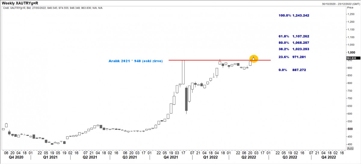 Gram altın cephesinde, Aralık 2021 ayında TL bazlı yaşanan şok ile 940 seviyesi test edilmişti. Geride bıraktığımız hafta ise gram altın 974 seviyesini test ederek tüm zamanların zirvesine yükseldikten sonra haftayı rekor bir kapanışla 963 seviyesinden kapattığını gördük. Teknik bir bakış açısı ile, yükseliş eğilimi korunabilirse, bir sonraki direnç seviyesinin 1,023 seviyesinde olmasını bekliyoruz.