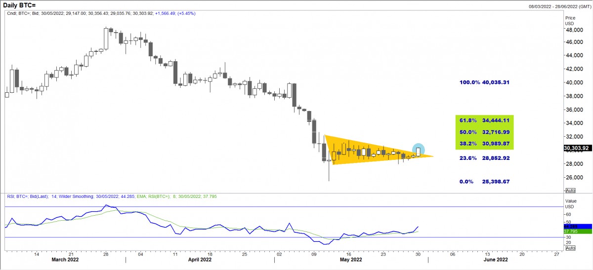 2022 yılına iyi bir başlangıç yapamayan Bitcoin, savaş, risk-off modu ve elbette Luna krizi ile 25,400 dolar seviyelere kadar gerilemesi ardından, yurtdışı olumlu havanın da yardımı ile bu sabah 30,300 dolar seviyesine kadar yükselerek sıkıştığı üçgenden de kurtuldu. Havanın bozmaması kaydı ile, iyimser görünümü korumasını ve yeşil renkli alanı hedeflemesini bekliyoruz.