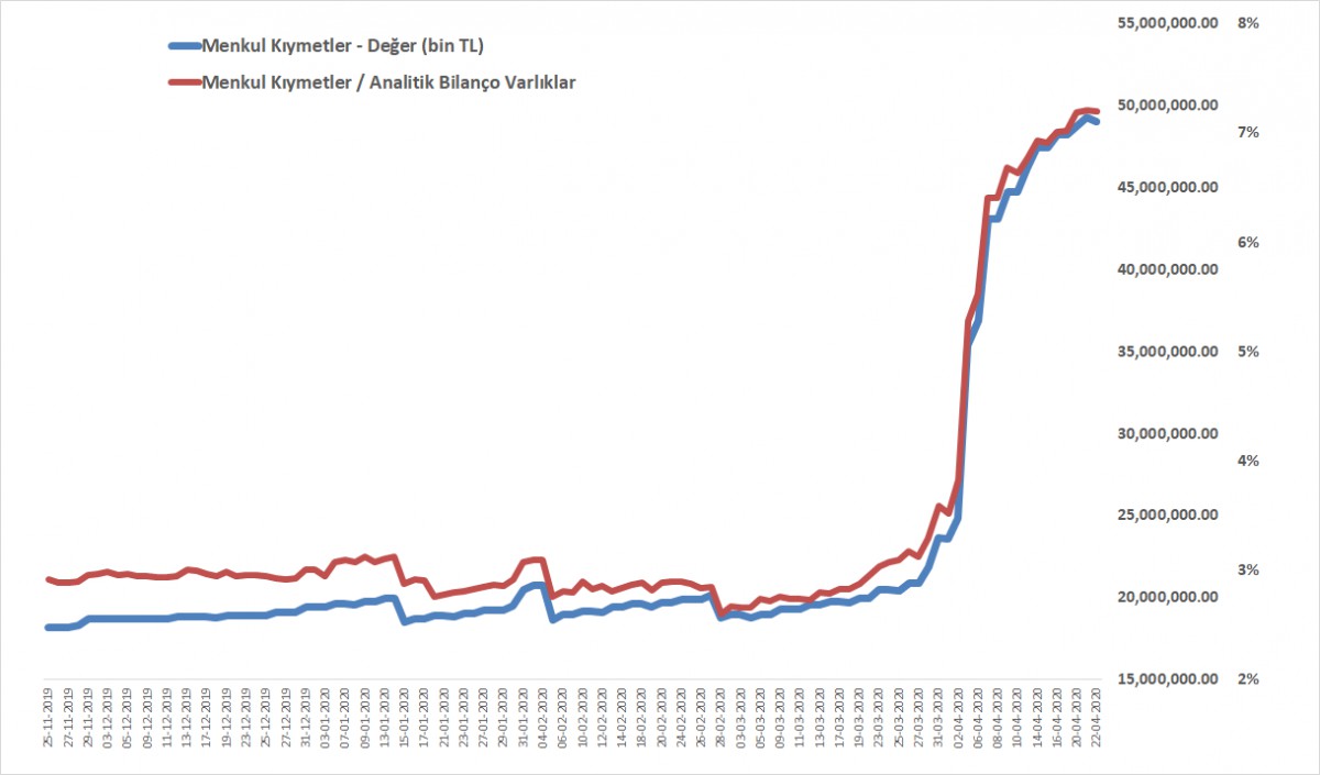 TCMB’nin iç varlıklarına baktığımızda, 22 Nisan itibarı ile bu kalem 150 milyar TL'ye yükselmiş. Mart ortalamasının 96 milyar TL oldığu düşünülürse, grafikten de görülebileceği üzere, TCMB yaklaşık 54 milyar TL'lik bir bilanço büyümesine gitmiş. Bunun yaklaşık 30 milyar TL'si TCMB'nin tahvil alımı ile sağlanmış (ikinci grafik), kalanı ise bankacılık sektörüne açılan krediler ile.