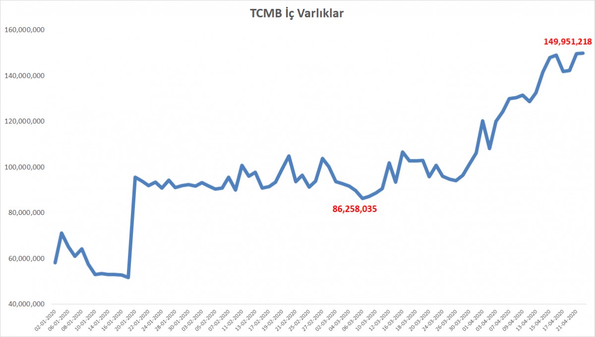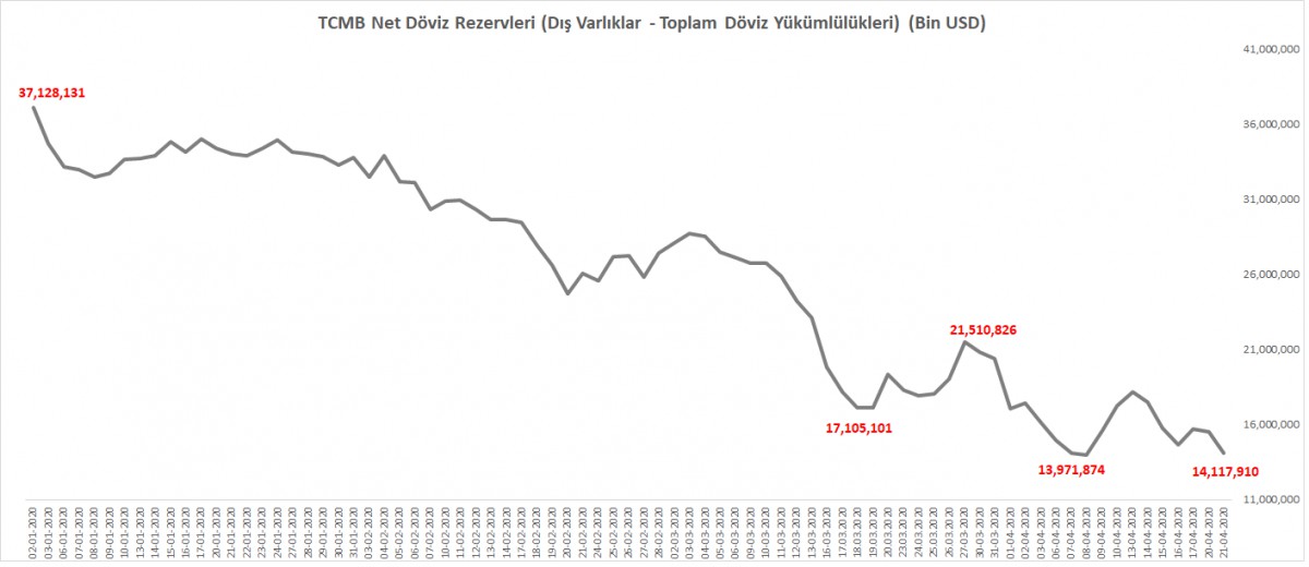 TCMB'nin net rezervleri ise, 21 Nisan ile biten haftada 14 milyar dolar sınırına yaklaştı (sene başı 37,1 milyar dolar idi).