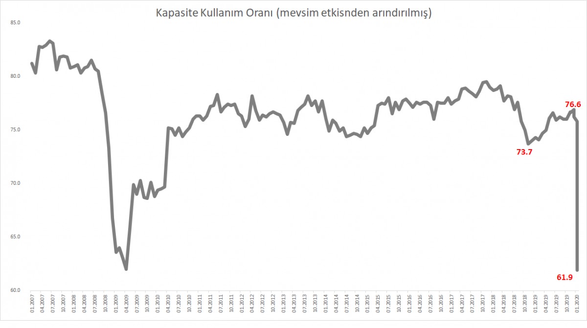 Korona virüs krizinin etkisi, Türk ekonomik verileri üzerinden de derinden hissedilmeye başladı. TCMB'nin açıkladığı Nisan ayı imalat sanayi kapasite kullanım oranı önceki aya göre 13,7 puan gerileyerek yüzde 61.6 oldu. Ekonominin kapalı olduğu bir dönemde, sert düşüşü normal karşılmak gerekiyor.