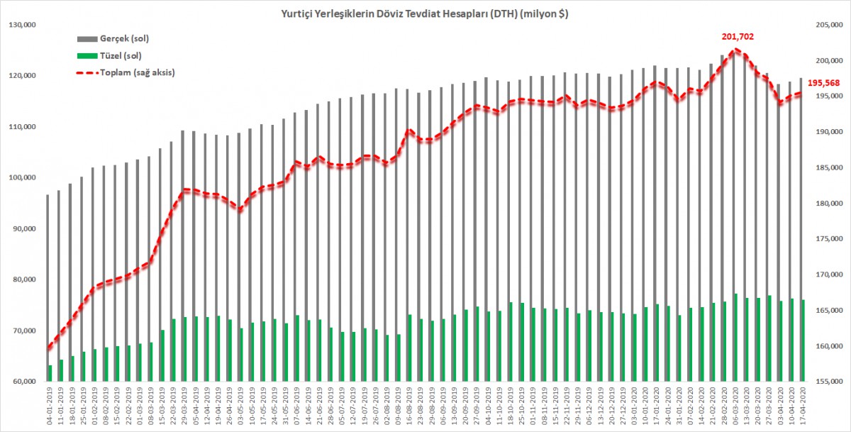 Yurtiçi yerleşiklerin DTH'ları, 0,7 milyar dolar artarak 119,5 milyar dolar seviyesine yükselirken (gri çubuk), toplam DTH ise, bir önceki hafaya nazaran 0,5 milyar dolar artarak 195,5 milyar dolar oldu.
