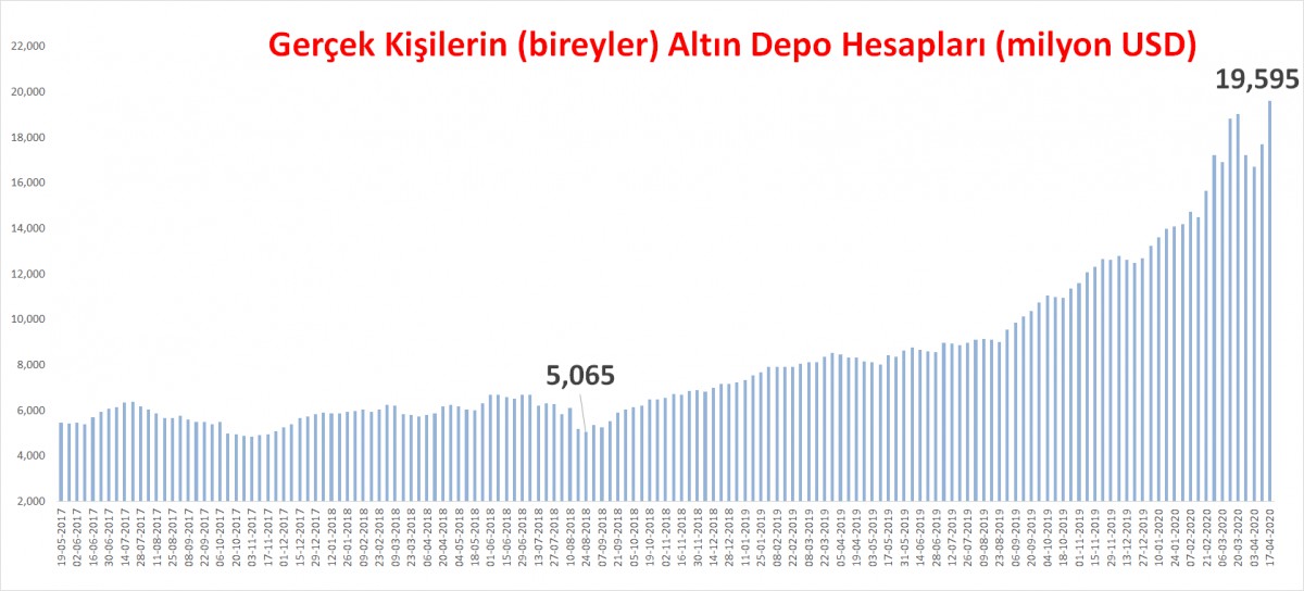 Bireylerin altın depo hesaplarında yükseliş (kuvvetle muhtemel altın fiyat artışından kaynaklı) devam ediyor.