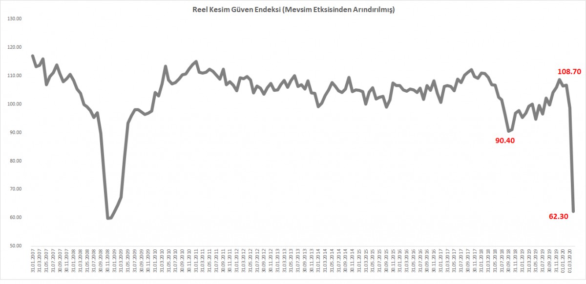 TCMB tarafından açıklanan reel kasım güven endeksi, tıpkı kapasite kullanım oranı gibi, Nisan'da bir önceki aya göre 36,3 puan azalarak 62,3 oldu.