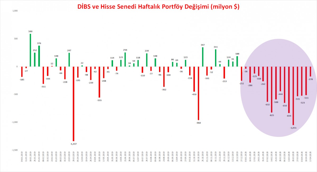 Yurtdışı yerleşiklerin TL ve TL cinsi varlıklara olan küskünlüğü son 17 haftadır devam ediyor. 17 Nisan ile biten haftada, yabancılar, hisse ve tahvil portföylerini 0,2 milyar dolar daha azaltarak son 17 haftada 7,9 milyar dolar çıkış yaptı (bu oldukça fazla).