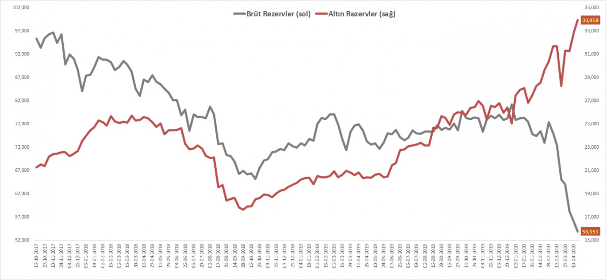 TCMB'nin brut döviz rezervleri 54 milyar dolar ile son 14 senenin dibine gerilerken, altın fiyatlarındaki artış ile altın rezervleri 34 milyar dolara dayandı.