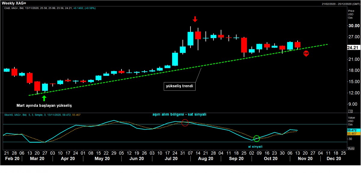 Aşı haberi, dün güvenli limanlara olan talebi azalttı. Gümüş sert satışlara sahne olsa da, yükseliş trend çizgisi korunuyor. Haftalık grafiklerde, 23,50 seviyesinin altında kapanışa dikkat edilmeli. Gümüşte pozisyonumuz yok.