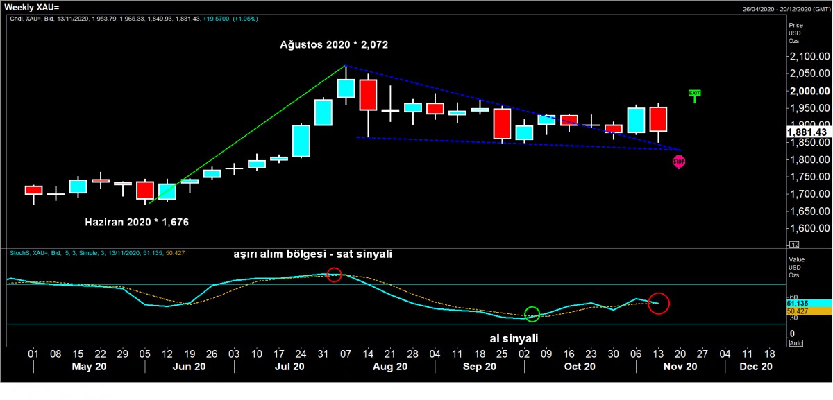 - Altının ons fiyatı, dün sabah saatlerinde (aşı öncesi) 1,960 dolar civarında işlem görürken, aşı haberi sonrası 1,860 seviyesine varan bir düşüş kaydetti. Benzer bir şekilde, gümüş de 26 dolar olarak dün de söz ettiğimiz direnç seviyesine kadar gelmesi ardından 23 seviyelerinin diplerine kadar gevşedi.