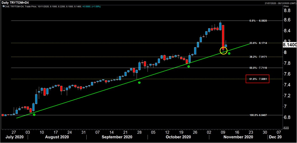 - Dün %6'ya varan düşüşle 8 seviyesine temas eden USD/TRY kurunun, yeni günü, ilk işlemlerde, 8,10 seviyesinden karşıladığını görüyoruz. Teknik seviye olarak, 8'in altına inilmesi durumda, 7,50 seviyesine varan bir düşüş ihtimal göz ardı edilmemelidir (bakınız grafik).