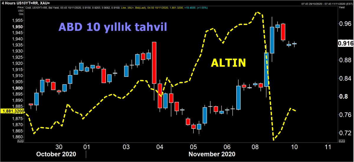 Aşı haberi ardından, güvenli liman arayışının azalması ile limanda çıkan gemiler misali, piyasa oyuncuları da ABD tahvillerini satarak, elde edilen dolar ile hisse senedi piyasalarına akın etti. Cuma günü %0,7 olan faiz, dün %1 seviyesine dayandı. Altının da, faiz artarken nasıl gerilediğini grafikten görünüz.