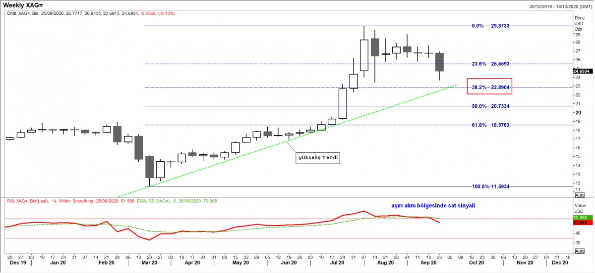 Piyasa tansiyonuna ciddi anlamda hassas bir emtia olan gümüş, dün günün en çok değer kaybeden finansal aracı idi. Gümüşü beğenmediğimizi, geçen haftalarda yaptığımız altın/gümüş rasyosu analizimiz ile anlatmıştık. Teknik bir bakış açısı ile, düşüşün devam etmesi durumunda, 23 seviyelerinin dipleriden tepki hareketi için ölçülü miktara alım (22,50 seviyesine zarar kes yazmak koşulu) ile denenebilir.