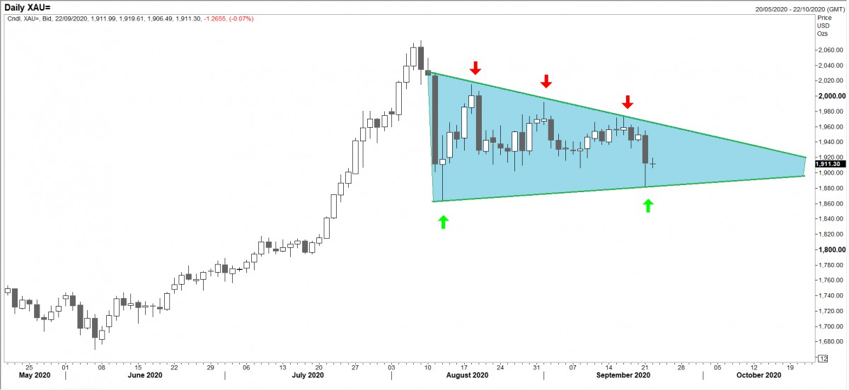 Altın cephesinde uzunca bir süredir korunan aşağıda 1,910/1,920 yukarda ise 1,965-1,975 bandı, dün aşağı yönlü kırıldı. Söz konusu bandın aşağılarında (1,910 altı) bulunan zarar kes emirlerinin tetiklenmesi ile 1,882 seviyesine varan düşüş oldukça hızlı oldu. Altında düşüş eğilimi başladı veya bitti yönünde güçlü bir yorumda bulunmak için çok erken. Bu nedenle, bir müddet mavi alanın içinde sıkışmayı (aşağıda 1,880-1,890 ; yukarda ise 1,950 – 1,960) takip edeceğimizi düşünüyoruz.