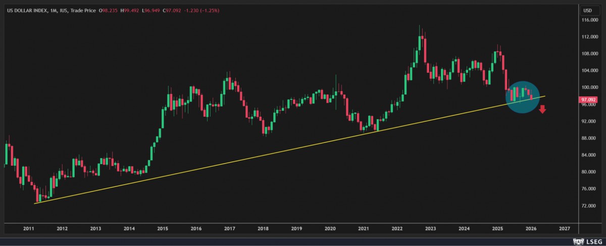 - Belki de en önemli konuyu sona saklamış olduk! Dolardan koşar adım uzaklaş ya da "ABD'yi sat" temasına paralel doların önde gelen para birimlerine göre değerini gösteren dolar endeksi (DXY) cephesinde beklediğiniz aşağı yönlü kırılımın artık an meselesi olduğunu itiraf etmemiz gerekiyor. Bültenlerimizi yakından takip eden okurlarımızın DXY'nin son 15 yılın destek seviyesi olan 97 sınırında neredeyse son altı aydır beklediğini ve aşağı yönlü kırılımın an meselesi olduğunu belirttiğimizi hatırlayacaklardır. Destek bölgesi olan 97 seviyesinin altında aylık bir kapanış (teyit) durumunda, doların değer kaybının şiddetleneceğini düşünüyoruz (bakınız grafik). Zaten para birimleri liginde, EUR ve GBP sırası ile 1,1900 ve 1,3700 seviyesine dayanarak son dört ayın zirvesini test ederken, DXY ise son sekiz ayın en kötü haftasını geride bırakması ardından alarm zillerini çalmaya devam ettiğini görüyoruz. Sezen Aksu'ya geri dönelim: Git, git, gitme ne olursun...