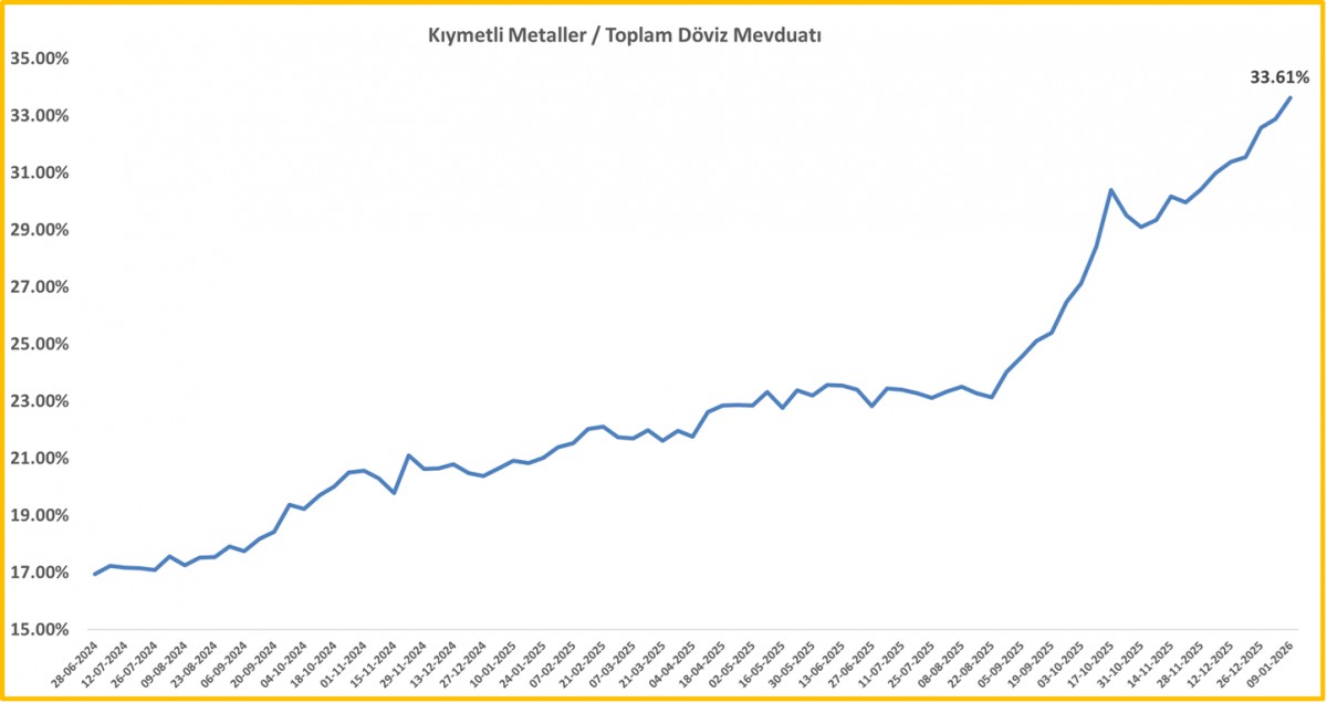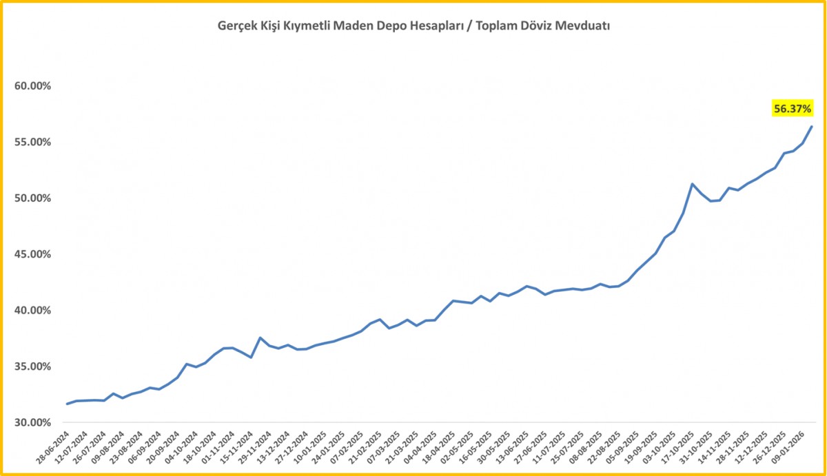 - Her hafta perşembe günü açıklanan TCMB ve BDDK verilerinin yine oldukça önemli ipuçları sunduğunu söylememiz gerekiyor. Şöyle ki, 16 Ocak ile biten haftada, yurtiçi yerleşiklerin mevduat tercihinde ana hatları ile %60 TP (Türk Parası), %40 Yabancı Para (YP) kompozisyonu korunsa da, YP içerisinde dolardan kaçış eğiliminin majör bir şekilde hissedildiği ve kıymetli madenlere yönelik âşkın ise kuvvetlenmeye devam ettiğini görüyoruz. Gerçek kişilerin söz konusu haftada 1,1 milyar dolar döviz mevduatları azalırken, yerine 1,5 milyar dolar kıymetli metal mevduatta geçtiklerini görüyoruz. Ekteki grafiklerden de görüleceği üzere, yurtiçi yerleşik gerçek kişilerin kıymetli metallerde mevduatı, toplam döviz mevduatının %56,4'üne tekabül ederken, yurtiçi yerleşik tüzel kişileri de denkleme dâhil edersek, kıymetli metallerin toplam YP mevduat içinde payı %34,77 seviyesine yükseldi! Bu oldukça yüksek bir oran!